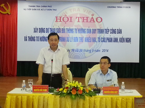 Ngày 19/5 tại Ninh Bình, Phó Tổng Thanh tra Chính phủ Nguyễn Đức Hạnh đã chủ trì Hội thảo lấy ý kiến góp ý cho Dự thảo Thông tư hướng dẫn quy trình xử lý đơn khiếu nại, tố cáo, phản ánh, kiến nghị thay thế Thông tư 04/2010/TT-TTCP ngày 26/8/2010 và Thông tư thay thế Thông tư 07/2011/TT-TTCP ngày 28/7/2011 về hướng dẫn quy trình tiếp công dân.