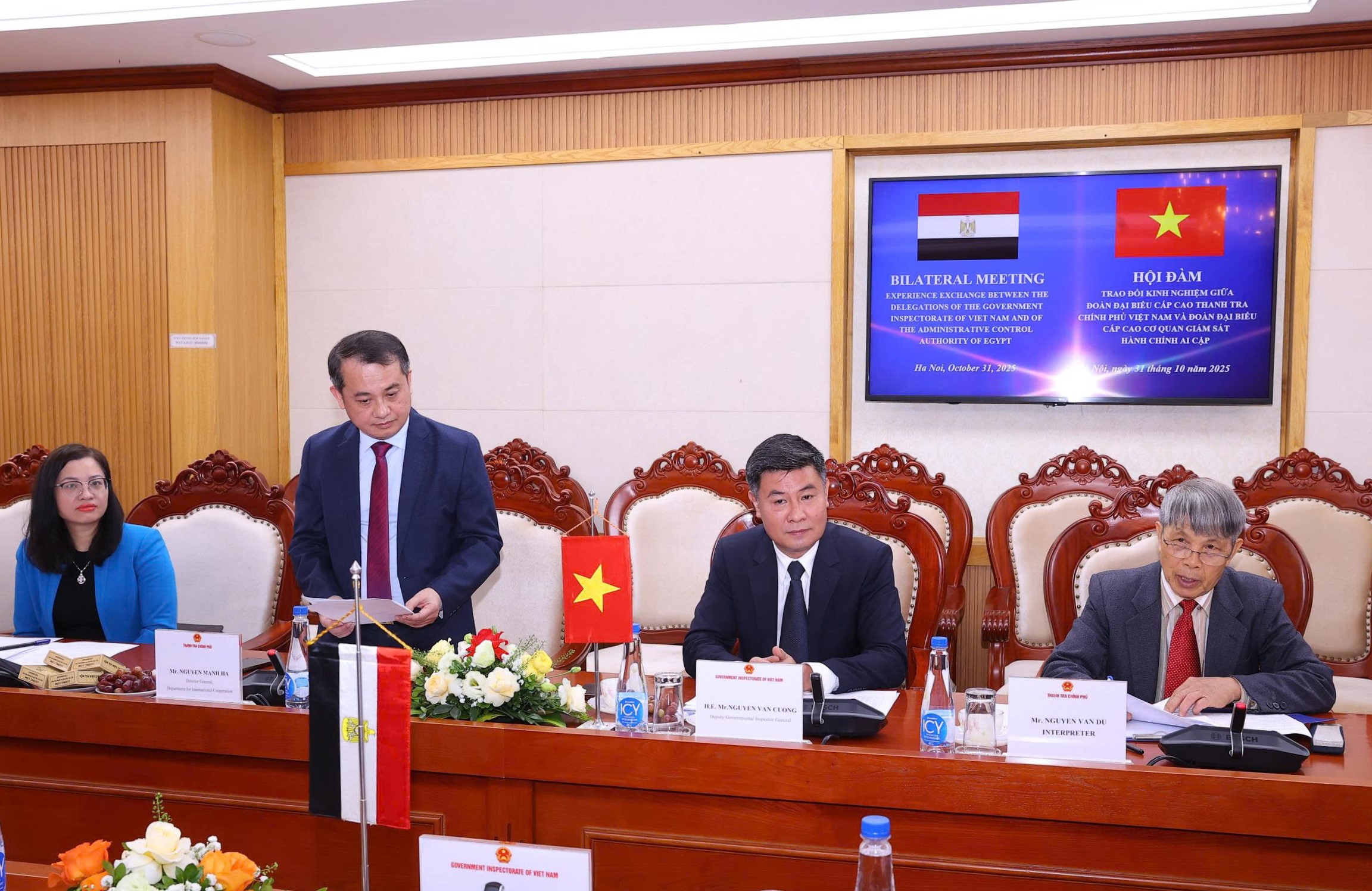 Ngày 31/10, tại trụ sở cơ quan Thanh tra Chính phủ, Phó Tổng Thanh tra Chính phủ Nguyễn Văn Cường đã tiếp và hội đàm với Đoàn đại biểu cấp cao Cơ quan Giám sát Hành chính Ai Cập do ông AMRO MOHAMED THARWAT MOHAMED ANWAR ELMARSAFY, Phó Quốc vụ khanh, Cơ quan Giám sát Hành chính Ai Cập làm Trưởng đoàn.